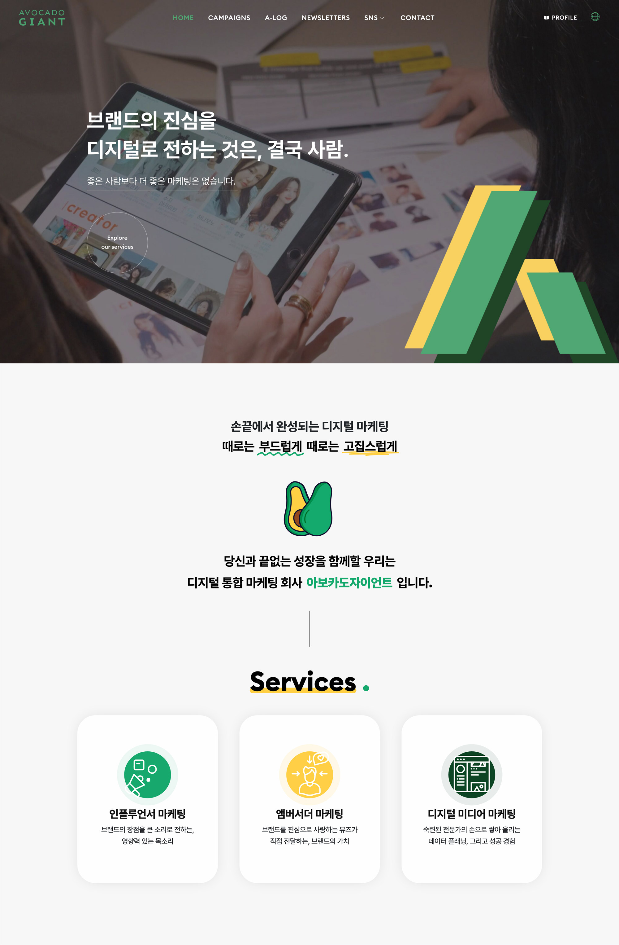 아보카도자이언트는 인플루언서 마케팅부터 디지털 광고까지 통합 마케팅 서비스를 제공하는 전문 기업으로, 브랜드와 소비자를 연결하는 전략적 콘텐츠와 캠페인을 기획·운영합니다. 본 프로젝트는 브랜드 아이덴티티를 반영한 그린 컬러 기반의 UI와 직관적인 레이아웃을 통해 친근하면서도 신뢰감 있는 이미지를 구축하는 데 중점을 두었습니다. 또한 애니메이션 아이콘과 스크롤 인터랙션을 활용해 각 서비스의 특징을 효과적으로 전달하고, 사용자 중심의 흐름 설계를 통해 몰입감 있는 웹 경험을 구현했습니다.